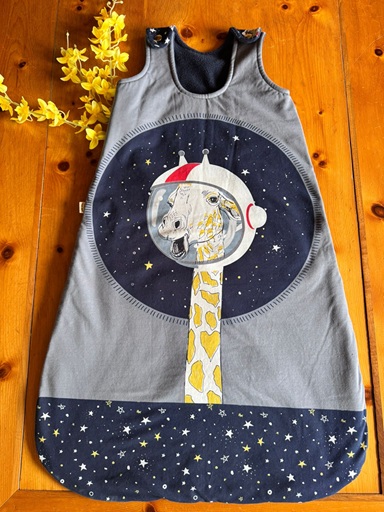 Liebevoller Selbstgenähter Babyschlafsack mit Druckknöpfen an den Schultern.